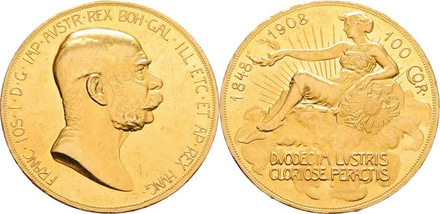 100 Koruna 1908 - jubilejní (pouze 16.000 ks), 33.850g, nep.hr., dr.rysky, téměř R!