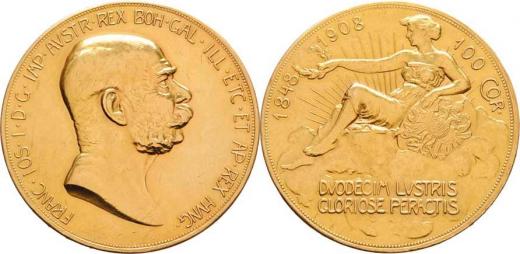 100 Koruna 1908 - jubilejní (pouze 16.000 ks), 33.798g, nep.rysky, patina R!