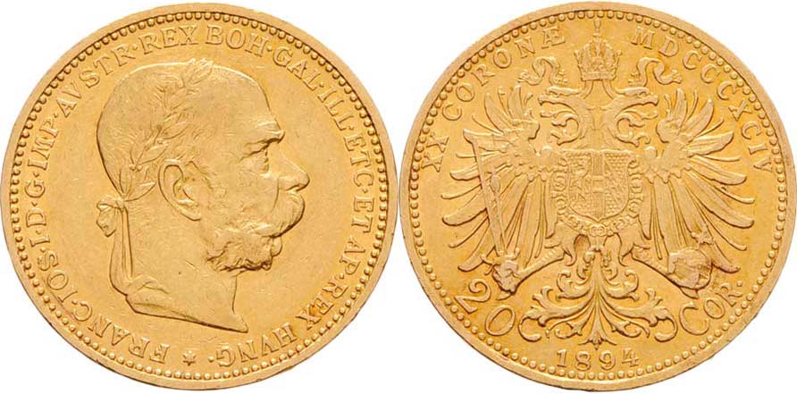 20 Koruna 1894, 6.747g, nep.hr.ražbou, nep.rysky, pěkná patina