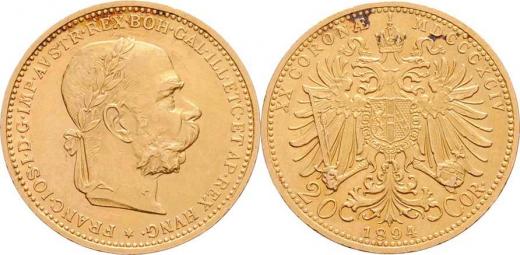 20 Koruna 1894, 6.759g, nep.hr., vlas.rysky, skvrnky, patina