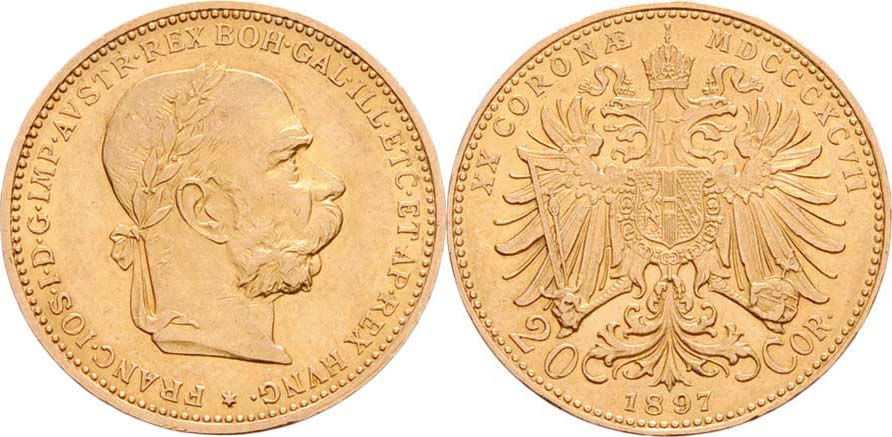 20 Koruna 1897, 6.772g, nep.hr., nep.rysky, téměř