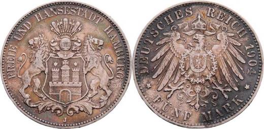 5 Marka 1904 J, KM.293 (Ag900), 27.611g, hr., rysky, skvrny, patina
