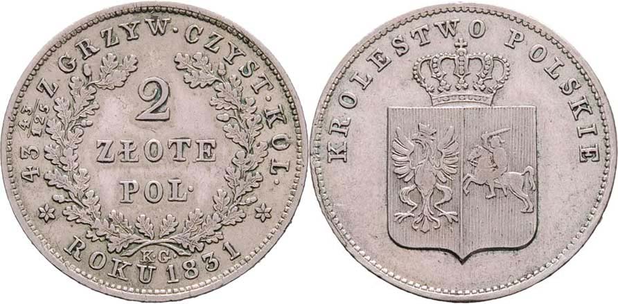 2 Zloté 1831 KG, Cr.123, Kop.2748, 9.072g, drobné vady razidla, nep.hr., nep.rysky, pěkná patina R!