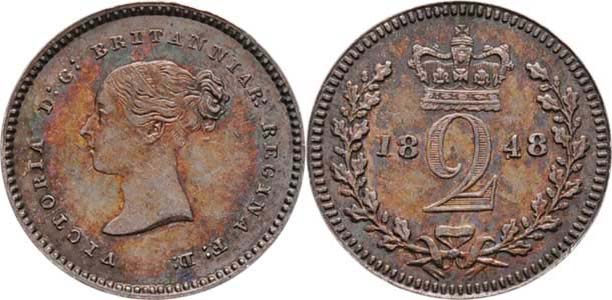 2 Pence 1848 - typ Maundy sets, KM.729 (Ag925, pouze 4.752 ks), 0.942g, nep.hr., nep.rysky, pěkná pat. R!