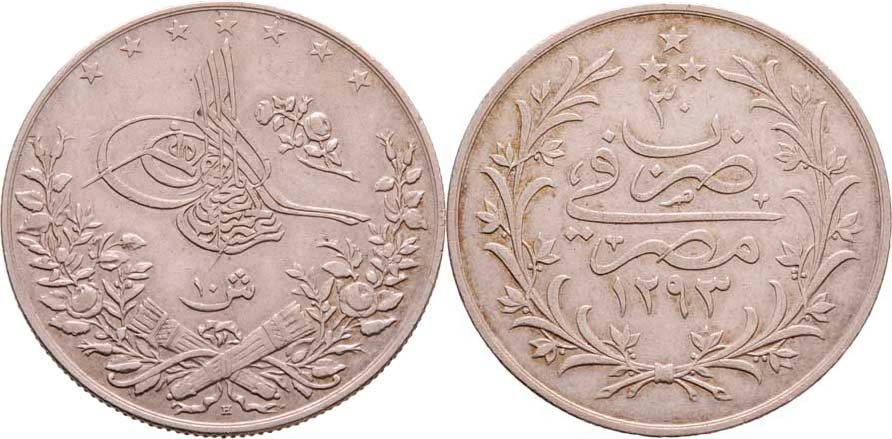 10 Qirsh, AH.1293, 30.rok vlády = 1905, KM.295 (Ag833), zn.H, minc.Birmingham, 13.927g, nep.hr., nep.rysky, pěkná patina