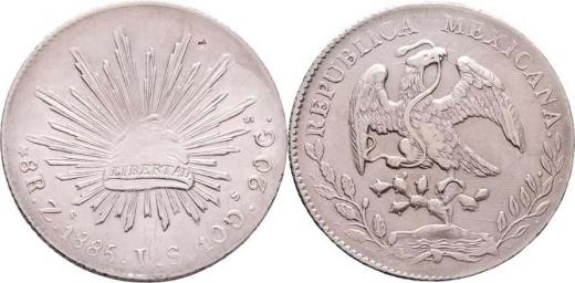8 Real 1885 Zs-JS, Zacatecas, KM.377.13 (Ag903), 26.943g, malá čínská kontramarka, dr.vady razidla, dr.hr., dr.rysky