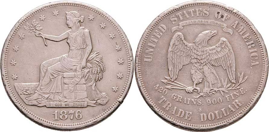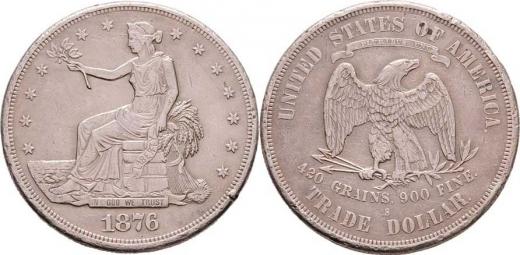 Obchodní dolar 1876 S, KM.108 (Ag900), 26.903g, hrany, dr.škr., rysky, patina R!