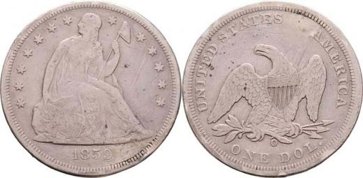 Dolar 1859 O - sedící Liberty, Y.45, 26.462g, stopa po oušku nebo zaletovaná dírka, hrany, škr., rysky, patina RR!