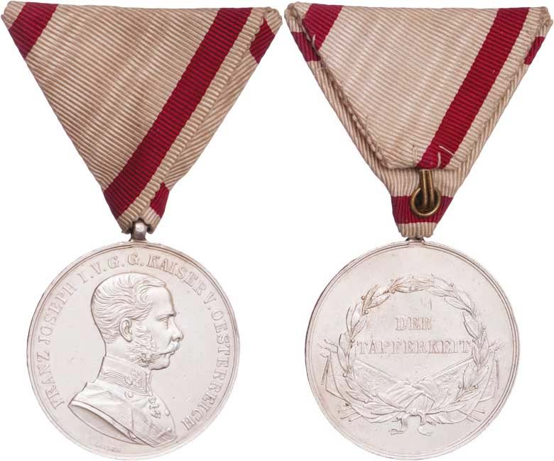 Velká stříbrná medaile za statečnost, Marko.230a, VM1.5-X-d, vydání z let 1914 - 1917, Sign.Leisek, punc. Ag800, dr.hr., rysky, stuha od jubil.kříže 1908