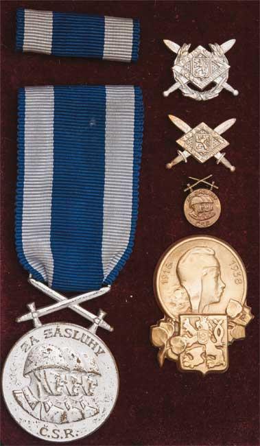 Stříbrná vojenská medaile Za zásluhy - pražské vydání - postříbřený bronz, VM.13-I-B, , stužka, miniatura bronzové medaile, tři další odznaky, nepůvodní etue