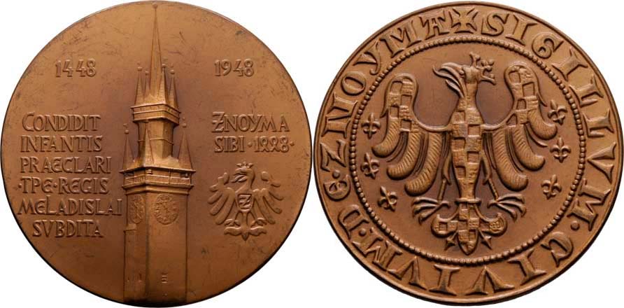 Znojmo - 500 let radniční věže 1948 - pečeť města / radniční věž, znak, vročení a latinský nápis, Sign., patinovaný bronz 70 mm