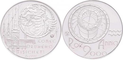 Rok 2000 - konec druhého tisíciletí - chrám sv.Víta, znaky, hvězdy, nápis / orloj, znamení Vodnáře, nápis, Sign., Ag999, 34mm, 16.0g, kapsle, etue, certifikát