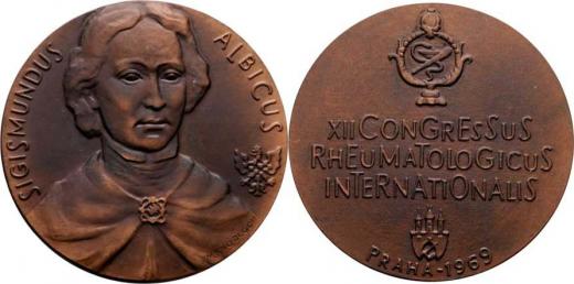Praha - mezinárodní kongres revmatologů 1969 - Sigismundus Albicus mírně zprava, znak, opis / emblém kongresu, znak Prahy, nápis, Sign., pat. bronz 60 mm