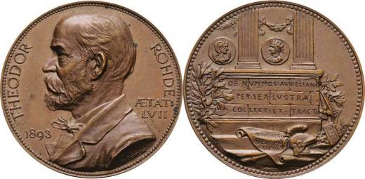 Theodor Rohde, numismatik - AE medaile 1893 - poprsí zleva, nápis a opis / chrám, antické mince, nápisy, Sign., patinovaný bronz 31 mm, téměř