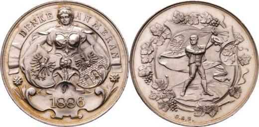 50 let založení lázní Meran 1886 - žena se znaky Tyrol a Merana, opis a vročení / muž s praporem a věnec z vinné révy, Sign., postř.měď 35 mm, téměř