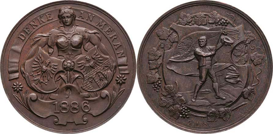 50 let založení lázní Meran 1886 - žena se znaky Tyrol a Merana, opis a vročení / muž s praporem a věnec z vinné révy, Sign., měď 35 mm, pěkná patina
