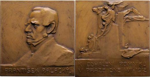 Odhalení pomníku Františka Palackého 1.VII.1912 - poprsí zleva, nápis / pohled na pomník, 2-řádk.nápis, Sign., patinovaný bronz 57x60 mm, skvrnky, téměř