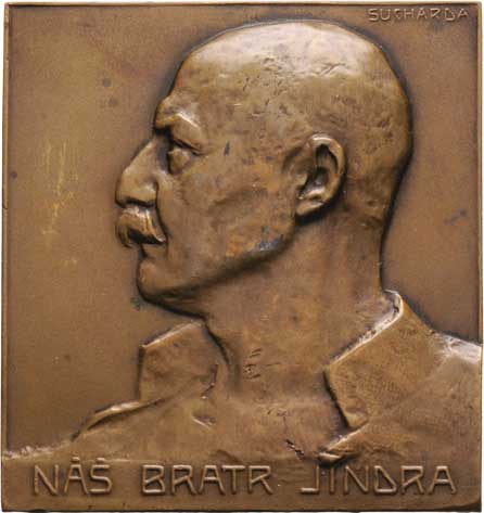 Náš bratr Jindra - jednostr. portrétní plaketa b.l. - poprsí zleva, nápis, Sign., patinovaný bronz 51x56mm, dr.hr., nep.rysky, v reversu dvě dírky se závitem