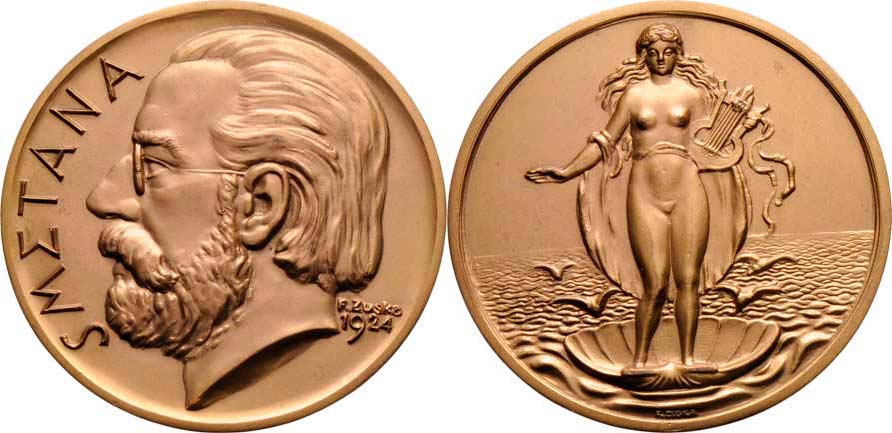 Bedřich Smetana 1924 - hlava zleva, opis / Afrodita stojící na lastuře s lyrou v ruce, mořští ptáci, Sign., patinovaný zlacený bronz 53 mm