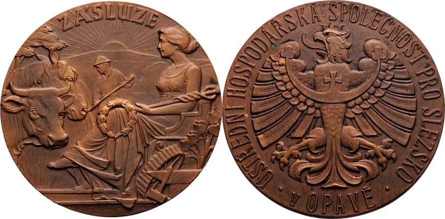 Karnet a Kyselý - Ústřední hospodář. společnost b.l. - slezská orlice, opis / sedící Silesia, muž sekající obilí, slunce, opis, Sign., pat.bronz, 51mm, 65.467g