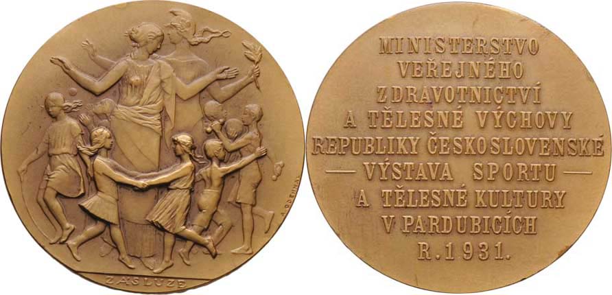 Odehnal - Výstava sportu a tělesné kultury 1931 - cvičící ženy s dětmi / 9-řádkový nápis, Sign., patinovaný bronz 45 mm, 33.854g, původní etue