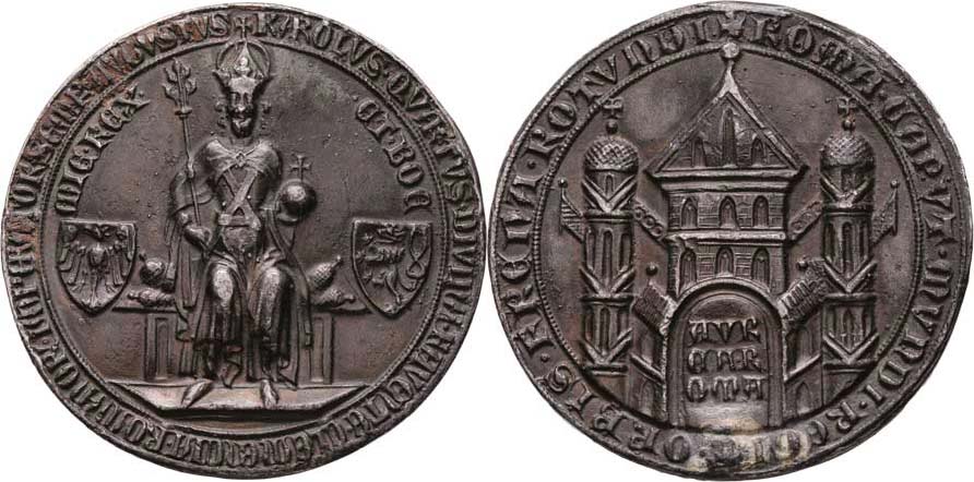 Karel IV. - 500 let vydání Zlaté buly (1356) b.l. - trůnící Karel IV., znaky, opisy / městská brána, opis a nápis (faksimile buly), olovo 60 mm, dr.hr. RR!