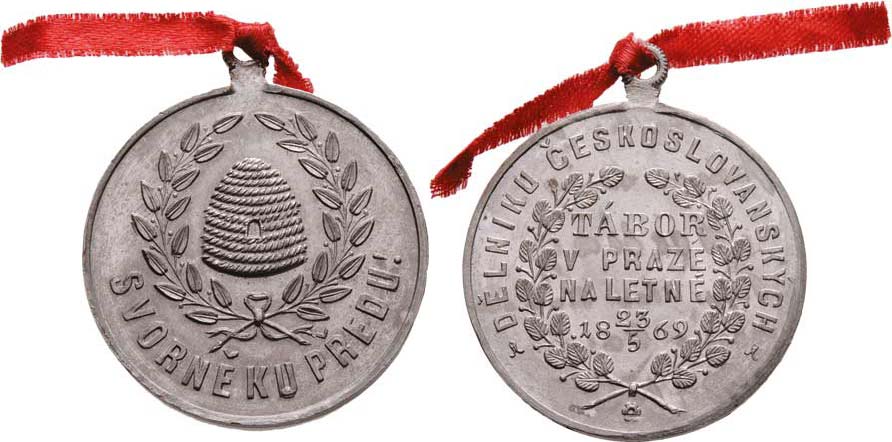 Tábor dělníků českoslovanských na Letné 23.5.1869 - úl ve věnci, opis / 4-řádkový nápis ve věnci a opis, Nesign., cín 32 mm s raženým ouškem, Don.4925, patina