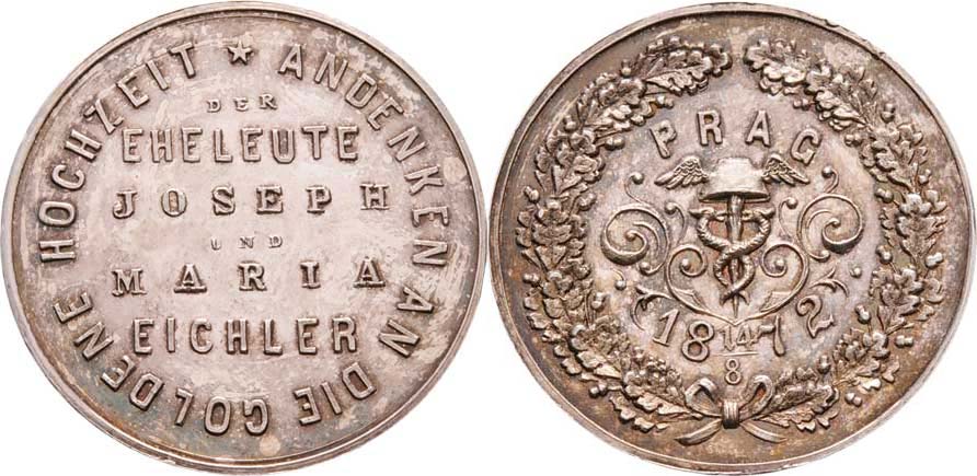 Josef a Marie Eichlerovi - zlatá svatba 14.8.1872 - Merkurova hůl a čapka, dub.věnec, něm.opis/ něm.nápis a opis, Nesign., Ag 29mm, 10.398g, nep.zvl., nep.hr.