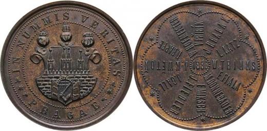 Pražský numismatický spolek 1886 - městský znak, opis / vročení, okolo 12 jmen členů, kružba, Nesign., měď 29 mm, Don.5024, H.6793, krásná patina R!