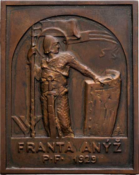 Šaloun L.- PF 1929 - sv.Václav se štítem a praporcem, nápis, Sign.LŠ, jednostr. patin. bronz 45x59 mm, Kr.9