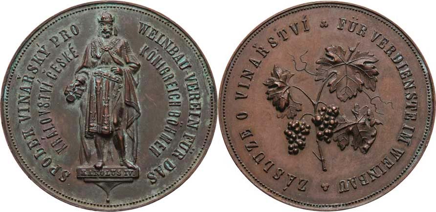 Spolek vinařský pro Království české b.l. - stojící Karel IV., dvojitý opis / vinná réva, opis, Nesign., jako ŠFP.11a, ale měď 44mm, 33.849g, patina, tém. RR!