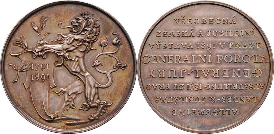 Braun - Stříbrná medaile pro generální porotu 1891 - český lev s praporcem / česko-německý nápis, Sign., Ag900, 44mm, 38.329g, ŠFP.18a, (uděl. 88 ks), pat. R!