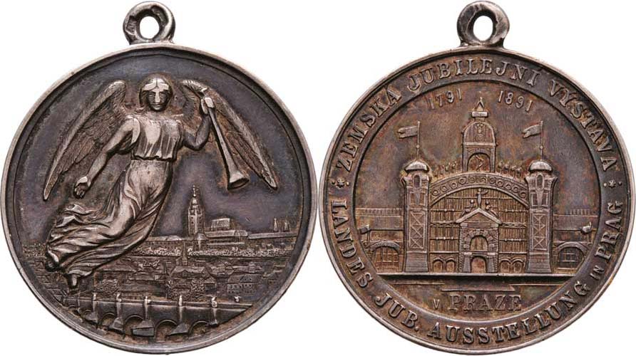 Nesign. - anděl s trubkou letící nad Prahou /ŠFP.neuv Průmyslový palác, vročení, česko-německý opis, Punc. Ag800, 29mm, 8.750g, nepublikovaný typ, patina RRR!