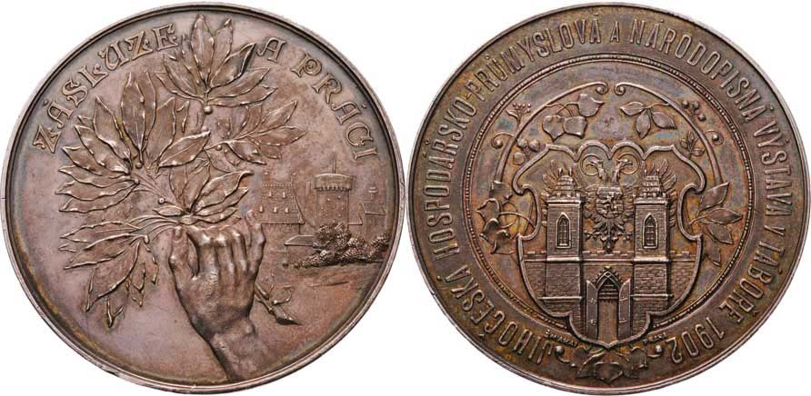 Šmakal - Jihočeská hospodář. výstava - Zásluze 1902 - městský znak v kartuši, snítky, opis/ ruka s vavříny, budovy, opis, Ag 53mm, 38.660g, dr.hr., dr.rys., pat.