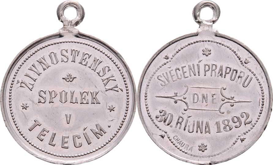 Chaura - svěcení praporu živnostenského spolku 1892 - 3-řádkový nápis / 3-řádkový nápis v kružbě, Sign., cín 26 mm s původním raženým ouškem, nep.hr., téměř