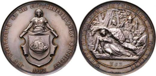Fischer a Loos - 1100 let objevení pramenů 1862 - znak města, německý opis / scéna objevení pramenů, německý opis, Sign., Ag 50mm, 57.167g, patina, téměř