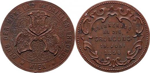 Klub přátel mincí a medailí 1890 - tři znaky, opis / 5-řádk. nápis v kartuši podle krejcaru Marie Terezie, Nesign., bronz 29 mm, nep.hr., skvrnky, patina, téměř