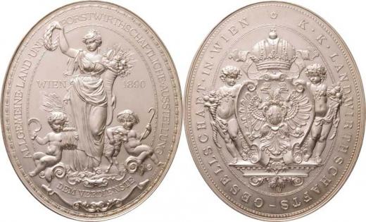 Jauner - Všeobecná zemská výstava 1890 - Zásluze - Austria, dva putti, písmo/ korun.císařský znak, opis, Sign., Punc., Ag800, 67/82 mm, 99.481g, vlas.rysky