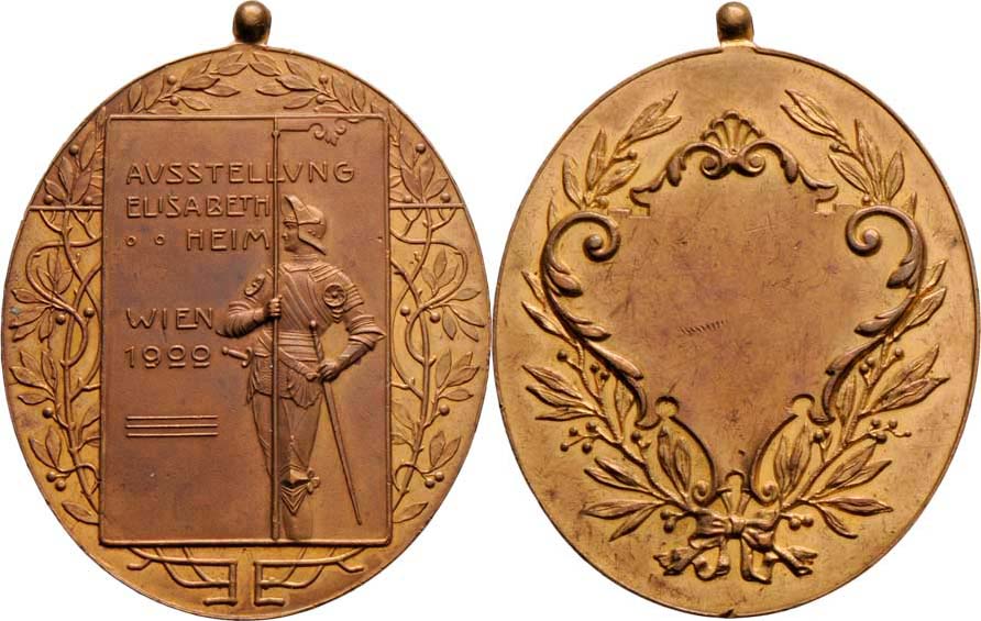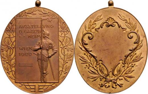 Výstava Elisabeth Heim 1900 - rytíř s praporcem, 5-řádkový nápis, vavřínový věnec, kartuše a vavřínový věnec, Nesign., část.zlacený bronz 51/61 mm s ouškem