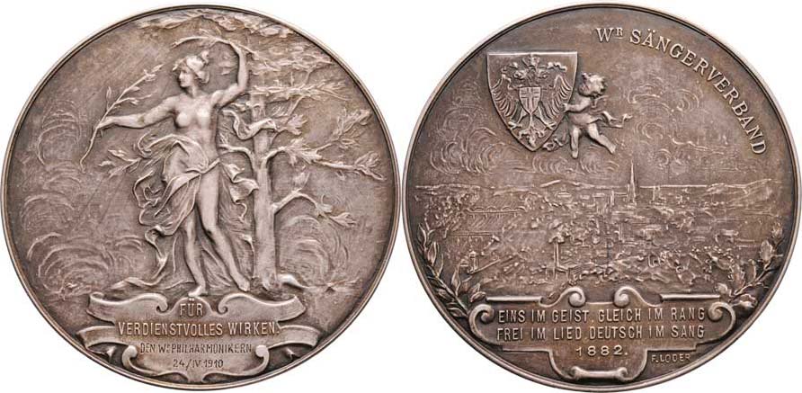 Loder - Vídeňský zpěvácký spolek 24.IV.1910 - múza u stromu, 4-řádk.nápis / putti se znakem, pohled na město, 3-řádk.nápis, Sign., patin. Ag 46mm, 29.932g