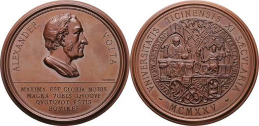 Pavia 1925 - prof. Alexander Volta, opis a nápis / pečeť university, opis, vročení, Sign.Johnson, patinovaný bronz 68mm, 154.378g, krásná patina R!