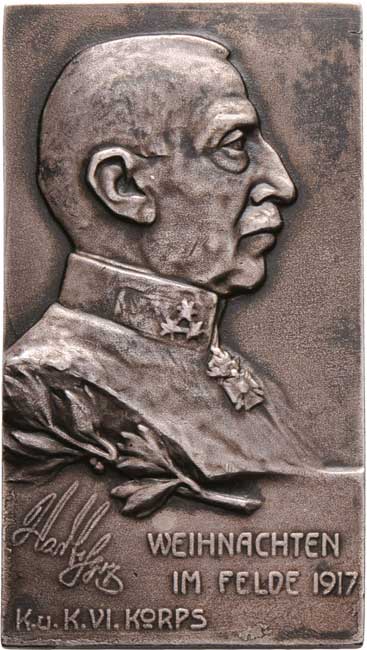 Emerich Hadfy von Livno - generál infanterie 1917 - poprsí zprava, ratolest, faksimile podpisu, nápis, Nesign., postříbřený zinek 38x70 mm, pěkná patina
