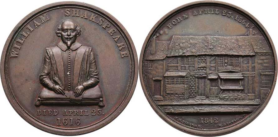 William Shakespeare - pamětní medaile 1842 - poprsí čelně, opis a nápis / rodný dům, opis a vročení, Sign.Young-Taylor, bronz 38 mm, pěkná patina, téměř