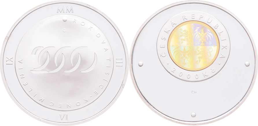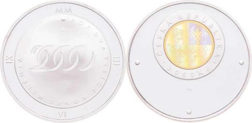 2000 Koruna 2000 - mileniová ražba s hologramem, (bimetal 3.11g Au + 31.10g Ag, 3.000 ks), kapsle, etue, pomačkaná karta, skvrny, obě strany v kvalitě