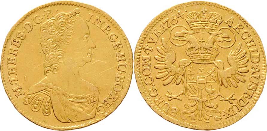 Dukát 1764, Vídeň, N.23, M-A.265, 3.468g, mírně zvlněný, vlas.rysky, pěkná patina R!