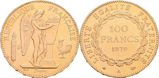 100 Frank 1879 A, KM.832 (Au900, pouze 39.000 ks), 32.246g, nep.hr., nep.rysky, pěkná patina, téměř R!