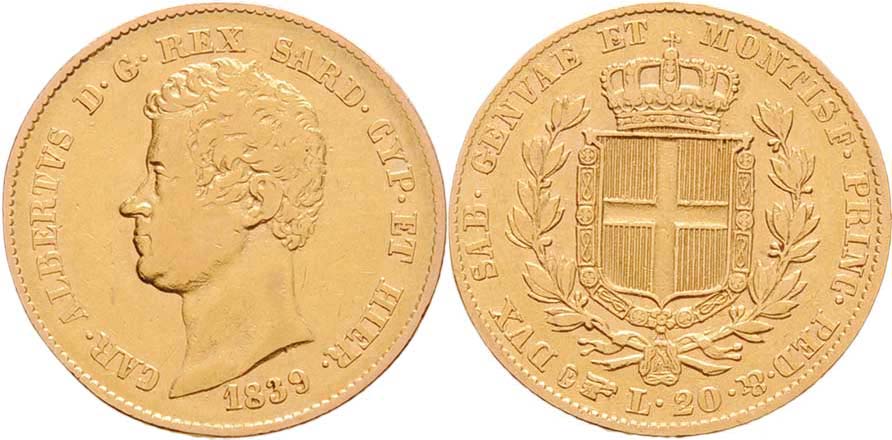20 Lira 1839, P+orlí hlava, Torino, KM.115.2 (Au900, pouze 70.000 ks), 6.351g, nep.hr., nep.rysky, patina