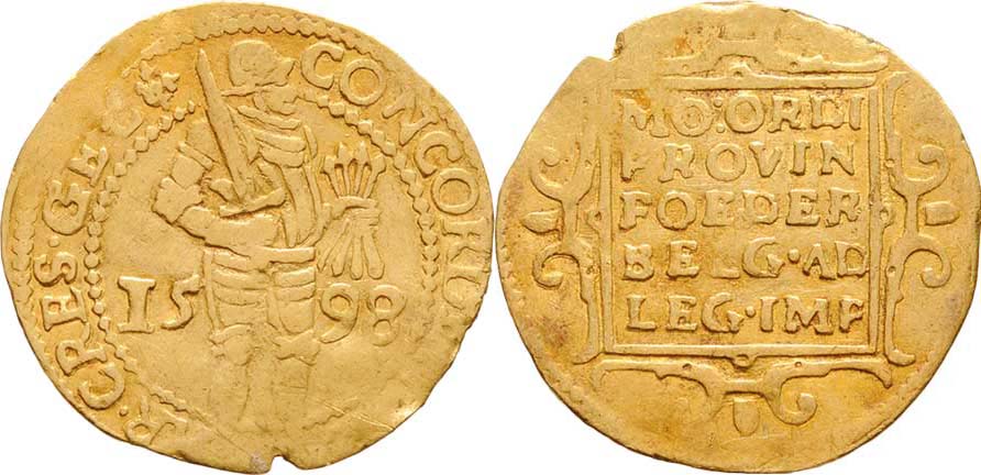 Dukát 1598 - Gelderland, Fr.237 (93), podobný jako KM.5, 3.395g, mírně zvlněný, dr.vada materiálu na hraně, pěkná patina