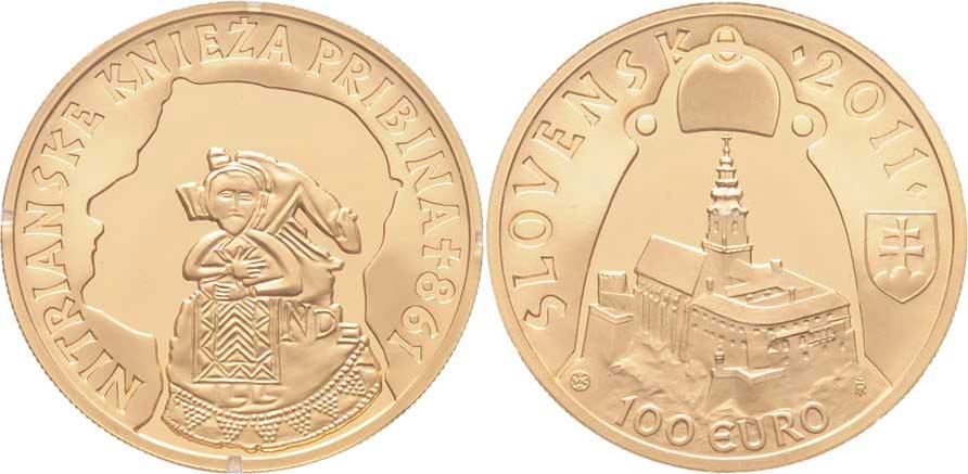 100 Euro 2011 - Kníže Pribina, KM.119 (Au900, 9.50g, pouze 7.000ks), kapsle, etue, text, přebal