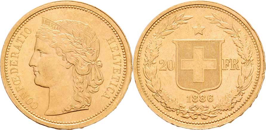 20 Frank 1886, KM.31.3 (Au900), 6.442g, nep.hr., nep.rysky, pěkná patina, téměř